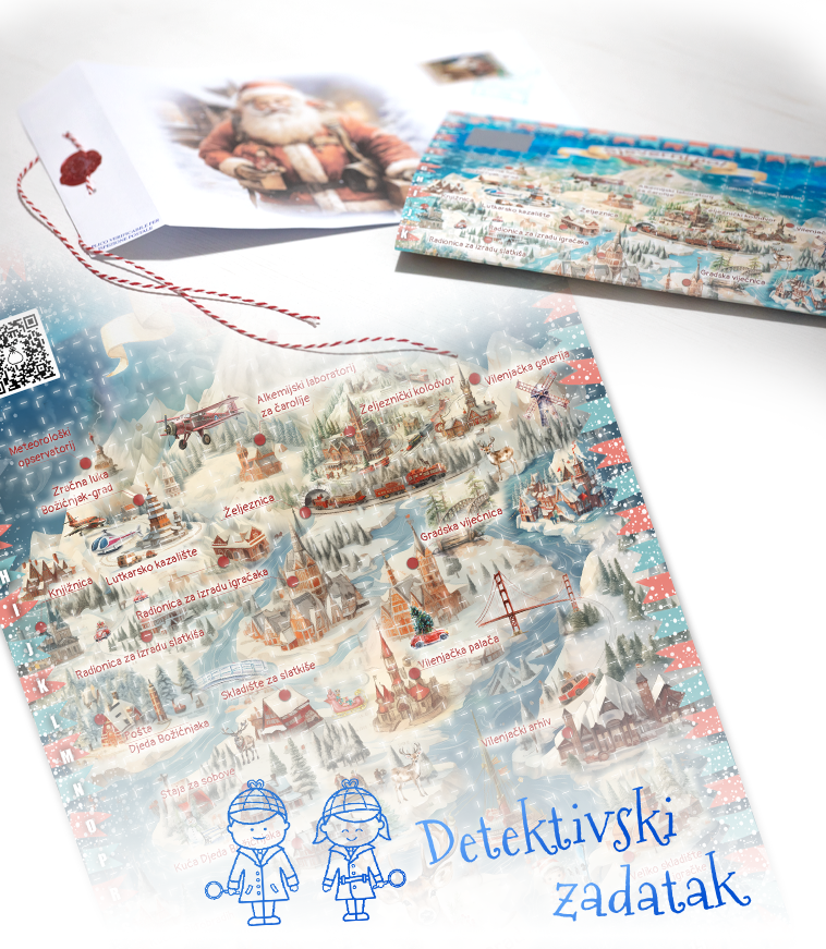 Treća dodatna (opciona) usluga: U kuverti zapečaćenoj voštanim pečatom, jamstvenikom i suhim žigom, stiže povjerljiva detektivska zadaća za cijelu obitelj. U osiguranoj kuverti se nalazi karta Sela Djeda Božićnjaka sa ucrtanim svim objektima, a s druge strane papira je jako težak detektivski zadatak. Valja vam, pažljivo promatrajući kartu, a prateći iza dane upute, pronaći vreću s darovima malog Ivice koju je patuljak Jura negdje izgubio. Zanimljiva je to avantura obzirom da ćete pažljivo morati pregledati svaki kut u Selu Djeda Božićnjaka. Morat ćete računati, procjenjivati, odgonetati, skenirati QR kodove i grebati greb-greb naljepnice. Vidjet ćete kuću Djeda Božićnjaka, radioniceu kojima patuljci i vilenjaci prave igračke, Mrazogradski željeznički kolodvor… „obići“ ćete još puno zanimljivih mjesta doj ne zaključite gdje je smotani Jura izgubio Ivinu vreću s darovima.